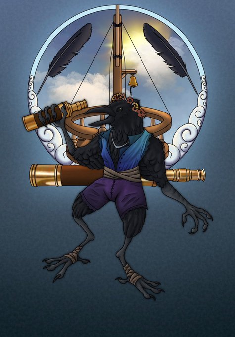 💨 Windsong Prince, the Breezespeaker Crow 🪶 Another deity from the pirate-themed #dnd setting I’m working on! Windsong holds domain over winds and waves that greet seafaring travelers. #dndart #digitalart #pirate #procreateart #ttrpgart
