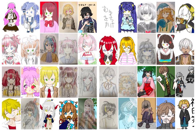 #にじさんじ五十音順に描いたら童田明治の時には画力上がってる説 とりあえずでまとめてた〜まぁ言えることはむゆちをかけ。そして40人超えてたんだって。凄いね。もどったりしてるから全然五十音順じゃないしその時上手くいったかにも関わってるから上手さとかはバラバラだねぇ。