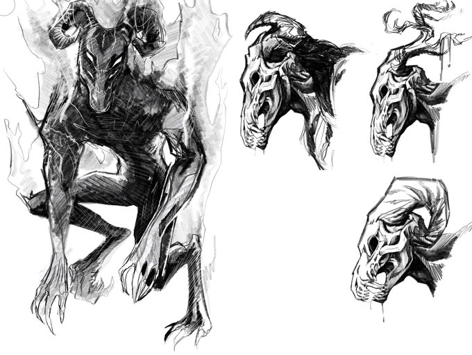 I’ve been kicking around some monster designs, I’m having a hard time with the horns, I’m just not liking any of them. Loving the skills though. #creaturedesign#sketchbook#inktober2021