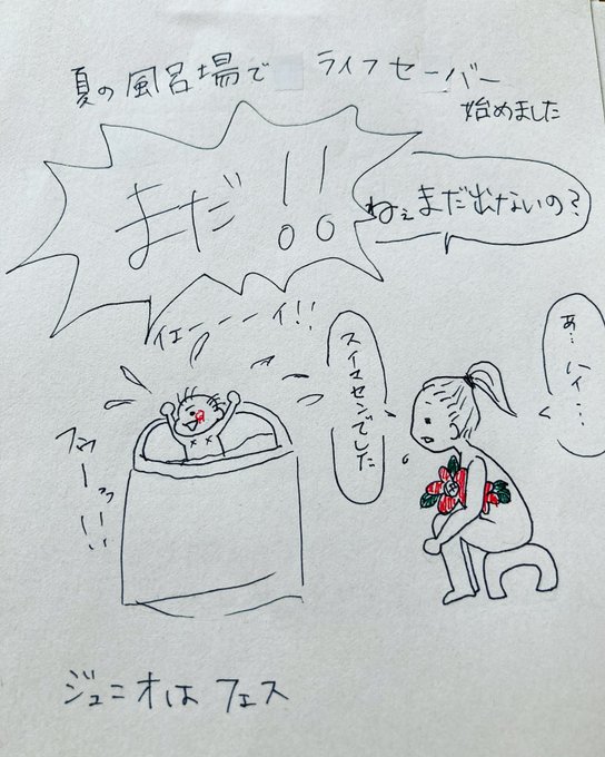 0 14 3歳の夏 ジュニオは激しく風呂を楽しんでいる もうフェス状態 ママはのぼせそうです #育児漫画 #育児日記 #育児絵日記 22/08/06 12:51