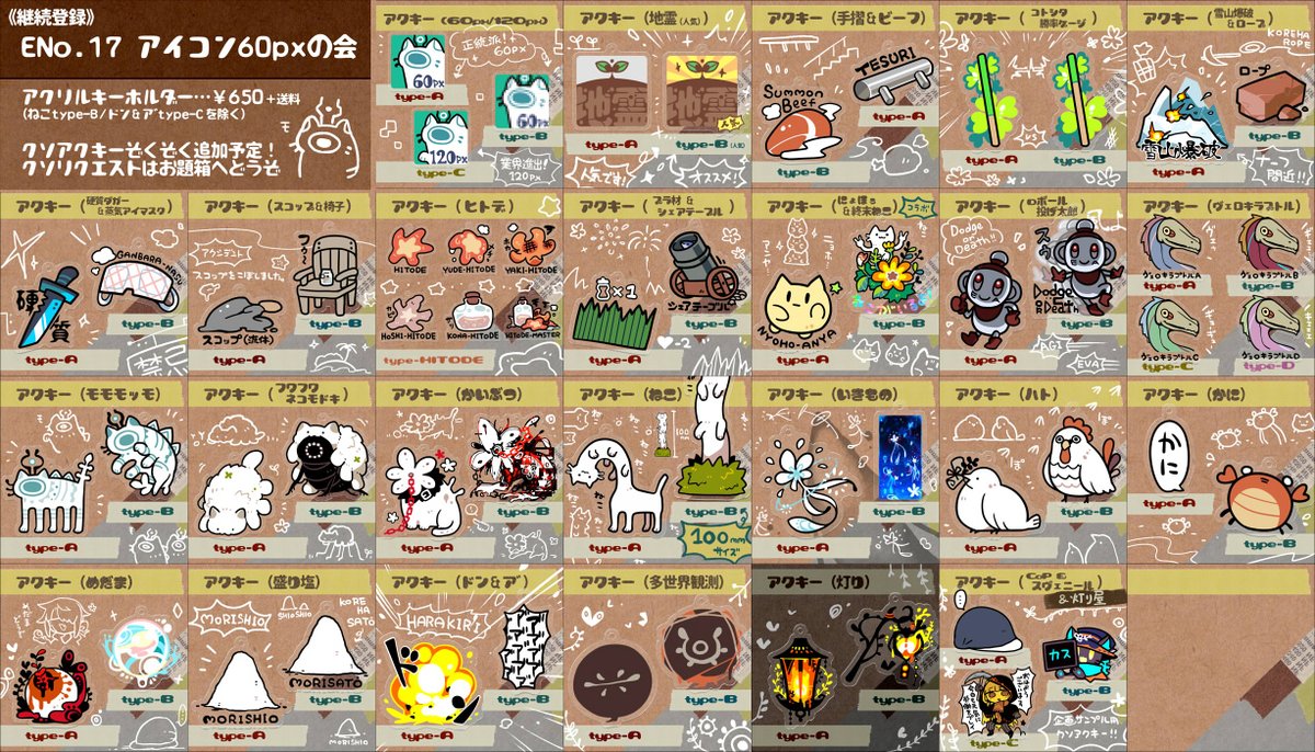 ウオオ設営ッ!継続登録Ⅲに『ENo. 17 アイコン60pxの会』で参加させて頂いております! 現在は再販品しか置いてありませんが、今回も【定ゲPCアクキー企画】を実施&リクエスト募集中です。よろしくね~! #継続登録3 【📜結果ページ】keizokutouroku.sakura.ne.jp/03/17_hxfc_kek… 【🎁BOOTH】feltnotes.booth.pm