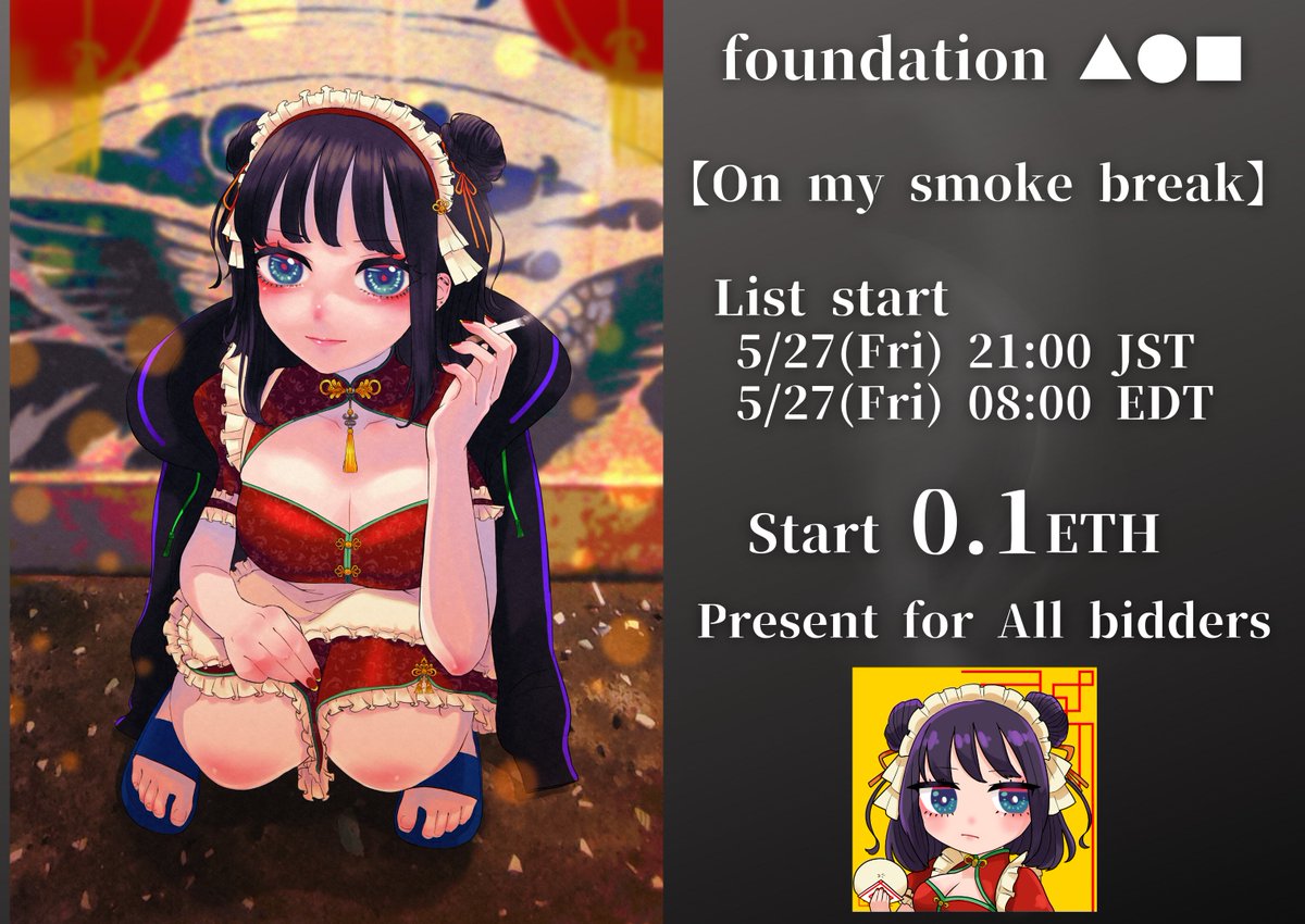 初Foudation 作品 ▲●■❤️🔥 【On my smoke break】 🚬List:5/27(Fri)21:00(JST)・5/27(Fri)8:00(EDT) 🚬Start:0.10ETH~ 🚬Bidder Benefit with "Mini Smoke Girl" foundation.app/@LemoNE/lemonz… on @foundation 🌐 #FND #FoundationNFT #Foudation #JPNNFT #nftart