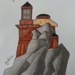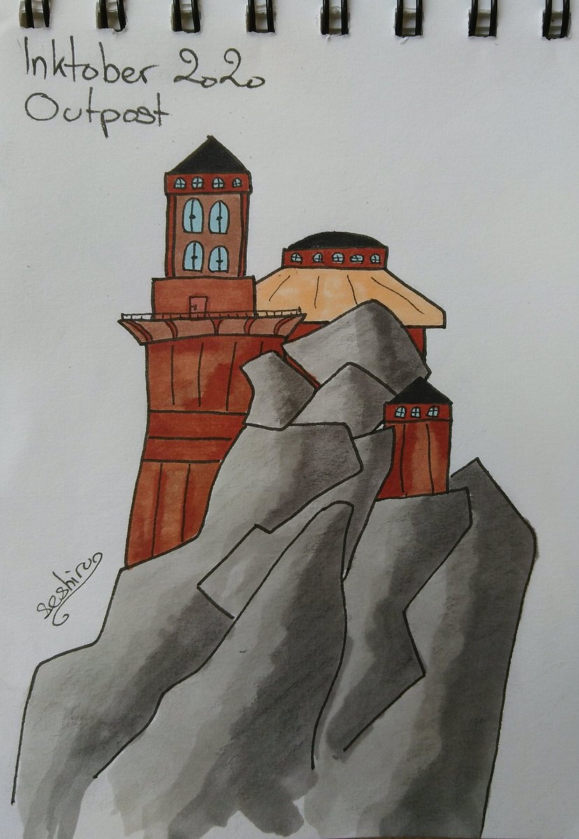 #inktober2020 jour 15 (ça commence à être long dis donc) "Outpost" Ce thème m'a... bloquée. Finalement, voici un petit avant-poste sur une falaise de cailloux.
