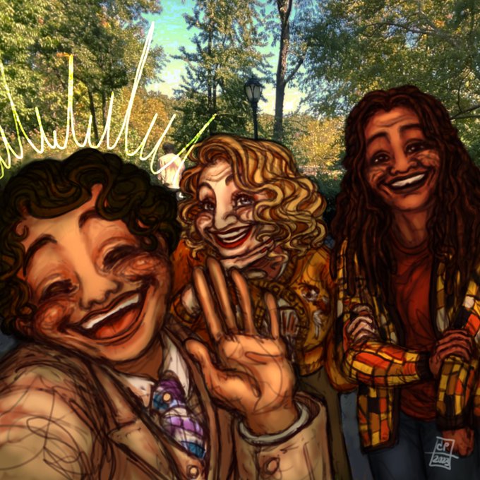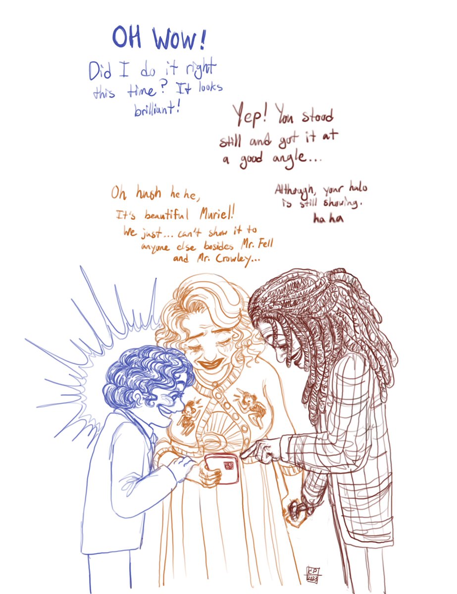 Nina and Maggie teach Muriel how to take a selfie . . . Unfortunately, Muriel’s halo showed up in each one because she was too excited (Nina and Maggie decided to keep the halo in and call it a day since they thought it was cute) #GoodOmens #GoodOmens2 #GoodOmensFanArt twitter.com/isolatedbug/st…
