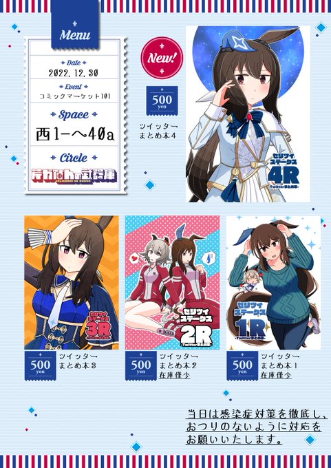 冬コミのお品書きです!12/30のコミックマーケット1日目は西1へ-40a『芹かなんの武器庫』でお待ちしております!売り子は葉月さん(#Hazukki_cos)にお願いしております!当日はアドマイヤベガのSnowy Integrity衣装を着ていただきます!よろしくお願いいたします🙌🙌 #C101 #C101お品書き