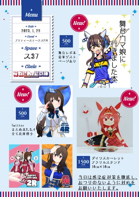 プリティーステークス27Rのお品書きです!1/29は横浜マリネリアのス37『芹かなんの武器庫』でお待ちしております!売り子はらんしぇさん(#r_ra_ra_r)にお願いしております!当日はアドマイヤベガのSnowy Integrity衣装を着ていただく予定です!よろしくお願いいたします🙌🙌 #プリステ27R