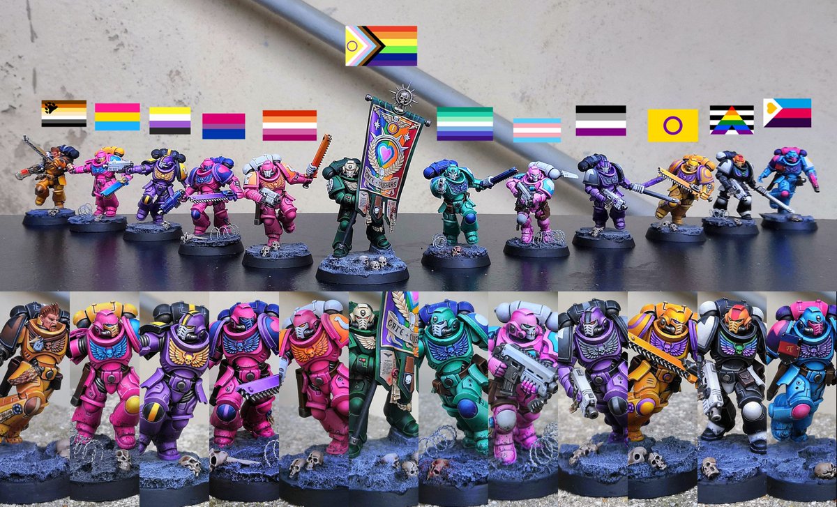 Picture of my #LGBT themed Space Marines squad, the "Gate Crushers" ! As you can see, I'm a miniature painter, not a wall painter. #Warhammer40k #WarhammerCommunity #paintingminis #paintingminiatures #w40k #LGBTQIA #spacemarines #PaintingWarhammer #warhammerisforeveryone