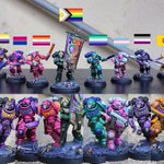 Slightly blurry picture of my current Space Marine #LGBTQ themed Kill Team. From left to right : #nonbinarypride #transpride #pansexualpride #lesbianpride