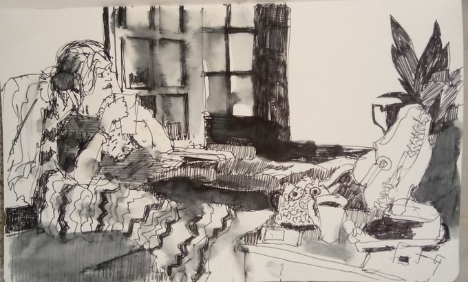 After an evening at the pictures, a visit to Best Kebab in Langley Park for supper and a quick sketch while it's made is the order of the day. Glowing like an oasis of tasty food in the dark autumn night. Brush pen & ink. #inktober2021 #penandink #thedailysketch #Langleypark