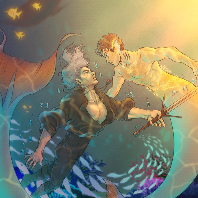 I’m trying to do some serious cute #erasermic mini-comics for #mermay but I ended up doing some stupid little mermaid au doodles with Aizawa as a merfolk, Hizashi as a human and Hawks as a himbo harpy here’s two dumb ideas inspired by two scenes in the little mermaid #mermay2021
