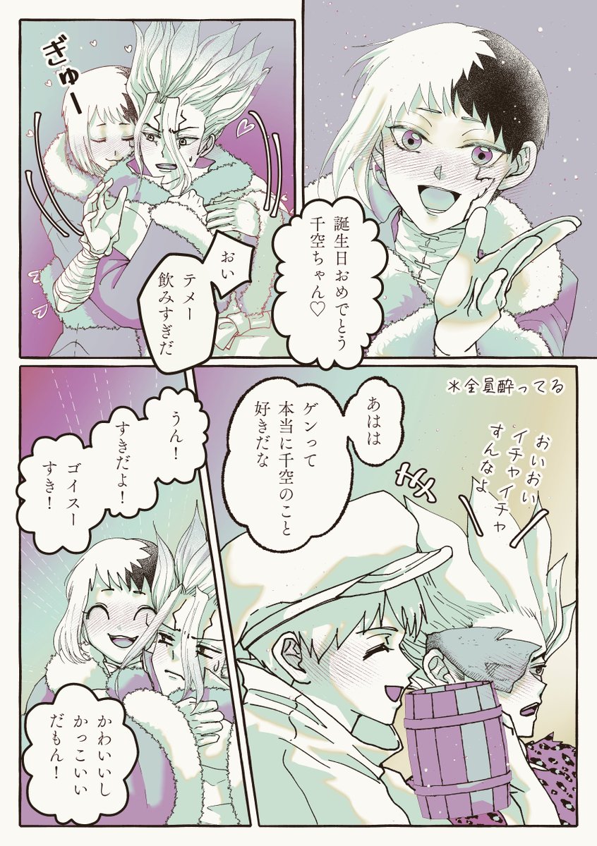 千ちゃん誕生日おめでとう🎉 今年も千ゲを描いた☺️ 内容は 🚢を作ってる最中、干空誕生日のお祝で酔っ払ってた千ゲ ↓ 二次復活後世界回り中、密かに片道🚀のことを考えている千と薄々気づいたゲ 3/6