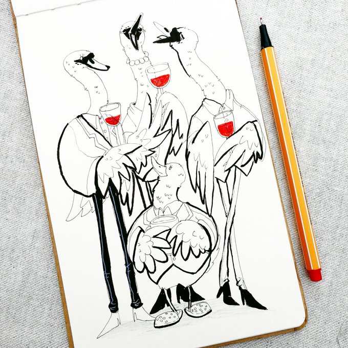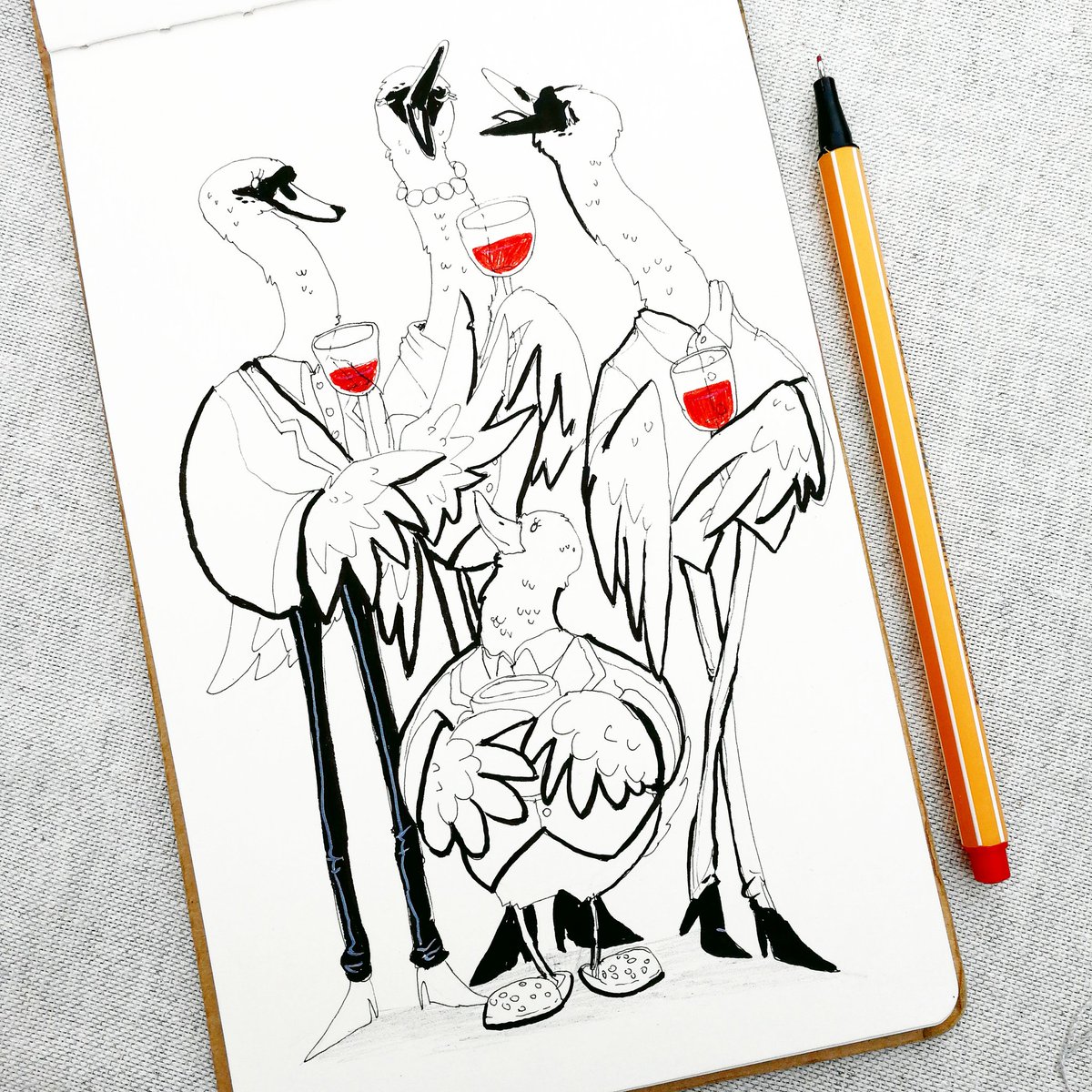 Inktober day 18 "Misfit" Little duck got a new job and her swan co-workers throw her a party so she won't feel like a misfit. 🍷☕ #inktober2019