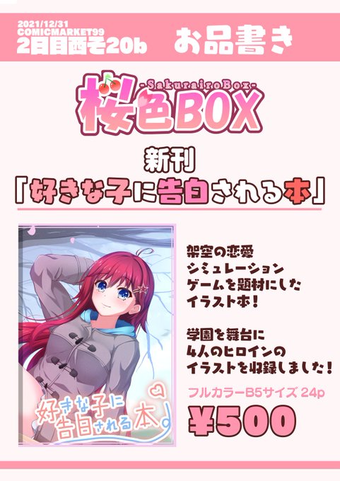 あなたのサークル「桜色BOX」は、コミックマーケット100で「土曜日東地区 "B " 27b」に配置されました!コミケWebカタログにてサークル情報ページ公開中です! webcatalog.circle.ms/Circle/1621495… #C100WebCatalog #C100