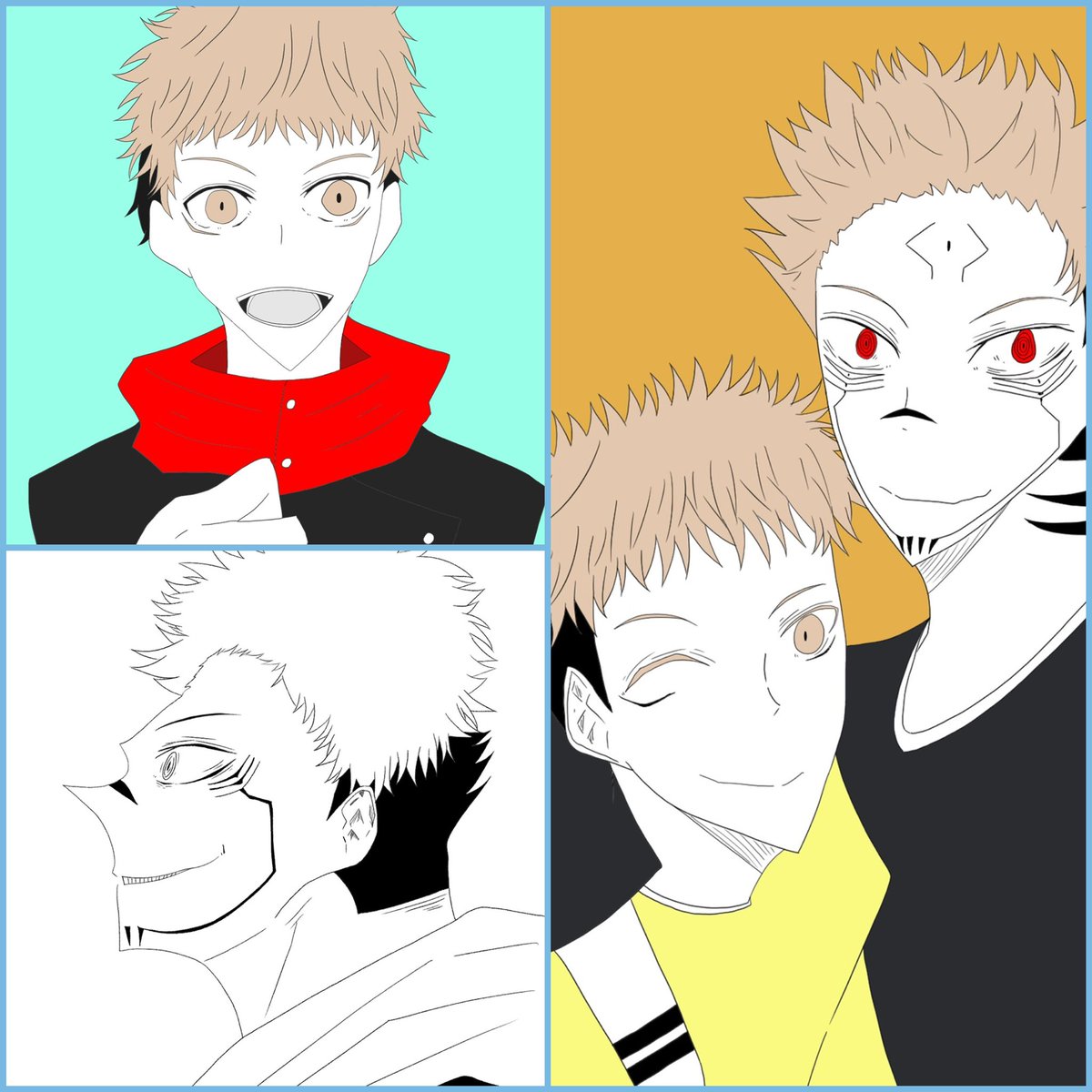 2 5 #今月描いた絵を晒そう 意外に少なかったけど、私からしたらいっぱい描いた方だと思う! 悠仁と宿儺が多いなぁ(笑) 21/06/30 23:19