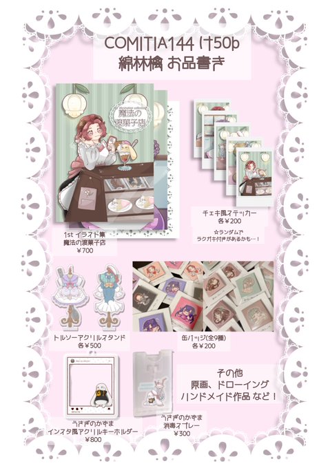 【🫧お品書き🫧】 5/5に東京ビッグサイトにて開催されるコミティア144初参加です❕ 1stイラスト集とチェキ風ステッカー(ランダムでラクガキ付き) をはじめ、他の子たちもよろしくお願いします✨ 原画やドローイング、ハンドメイド作品は後ほど告知します🤭💕 #COMITIA144 #COMITIA144お品書き
