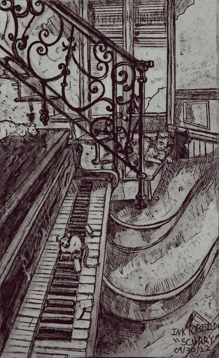 #inktober2022 #scurry Haunted abandoned house background with mice scurrying around while a hungry alley cat stalks them from the bottom of the staircase. #Pencildrawing 🐭