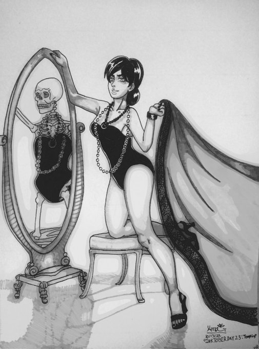 #Inktober day 25: "#Tempting". 💀 For this #inktober2022 prompt I decided to draw my #OC Rosario a.k.a. la muerte tempting the viewer with her beauty while in the glass reflection shows her true intent. #InkDrawing #lamuerte