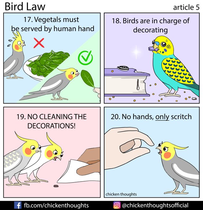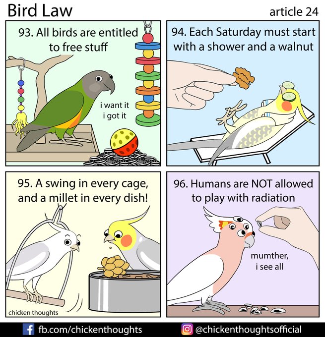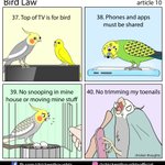 Bird Law article 4 starring Pumpkin & Gizmo (@pumpkin_and_fiddler on Instagram), Calypso, Pipsqueak & Chirpy (fb.com/profile.php?id…)!