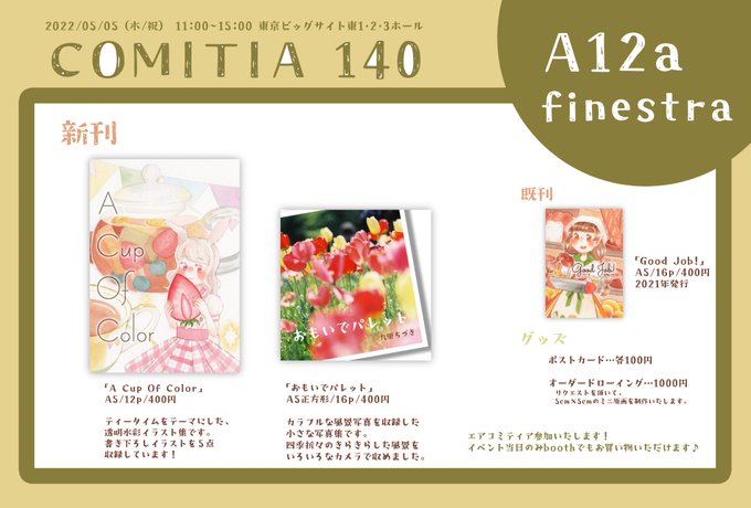 COMITIA140参加いたします! *東京ビッグサイト東1・2・3ホール *5/5(木/祝) 11:00~15:00 お品書きできました! 東3ホール、【A12a】finestraにてお待ちしております〜🎪 新作イラスト本、写真集、ポストカードを持っていく予定です! どうぞよろしくお願いします〜🌱 #COMITIA140 #コミティア140