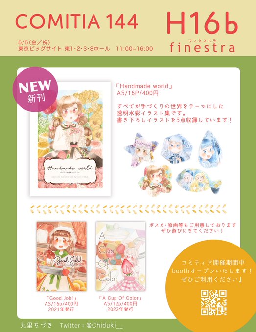 📝お知らせ📝 コミティア144参加いたします! *東京ビッグサイト東1・2・3・8ホール *5/5(金/祝) 11:00~16:00 東2ホール、【H16b】finestraにてお待ちしております〜🎪 透明水彩イラスト本、原画、ポストカードを持っていく予定です! どうぞよろしくお願いします🌱 #COMITIA144 #コミティア144
