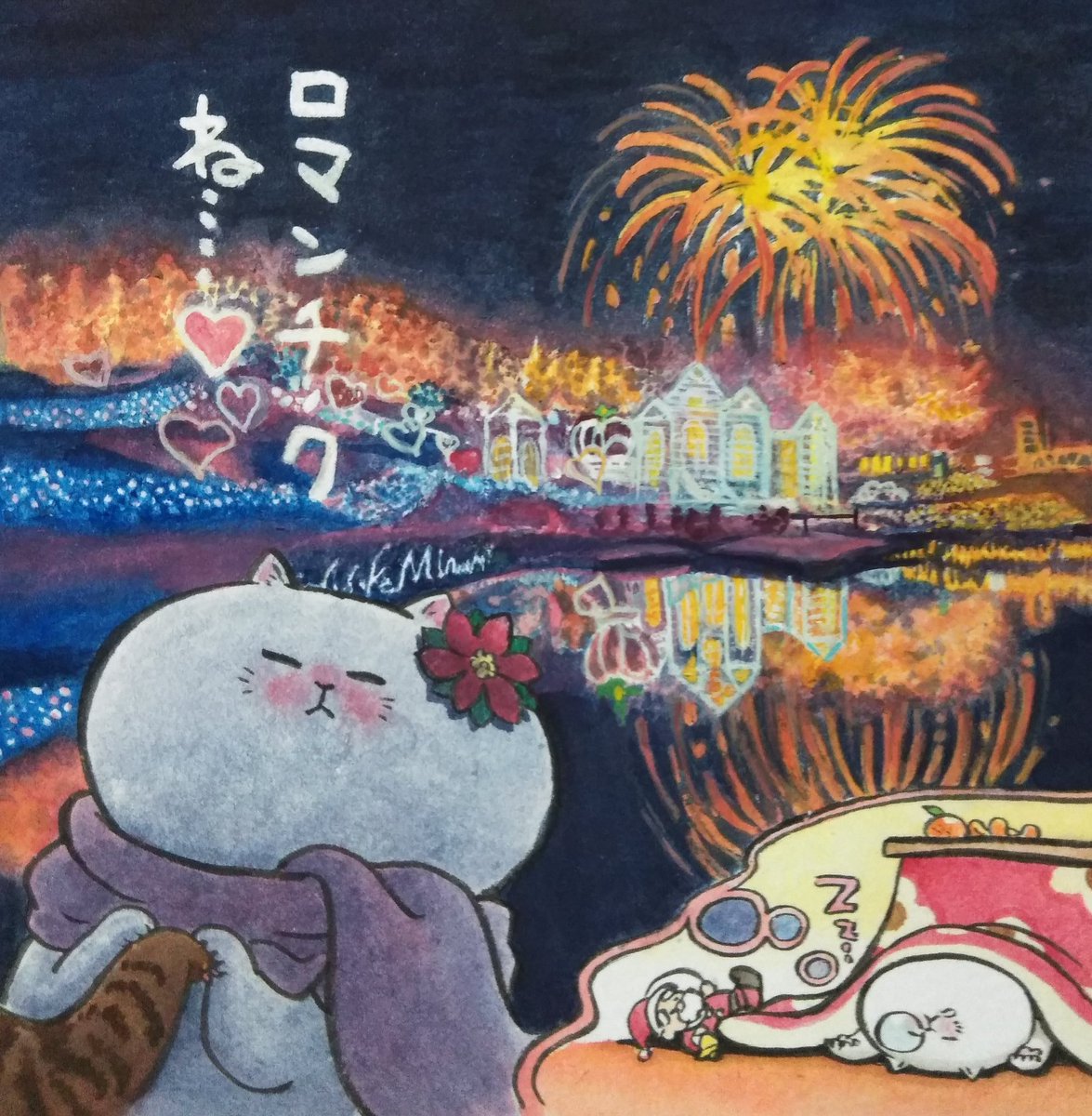 来年度カレンダーの最後の一枚、完成!! 備北丘陵公園のイルミネーションです✨ 地形や樹形を活かして70万個ものLEDが輝く様子は圧巻! #来年度カレンダー #広島県庄原市 #備北丘陵公園イルミネーション #ねこ #水彩画 #アナログイラスト #アナログ絵描きさんと繋がりたい