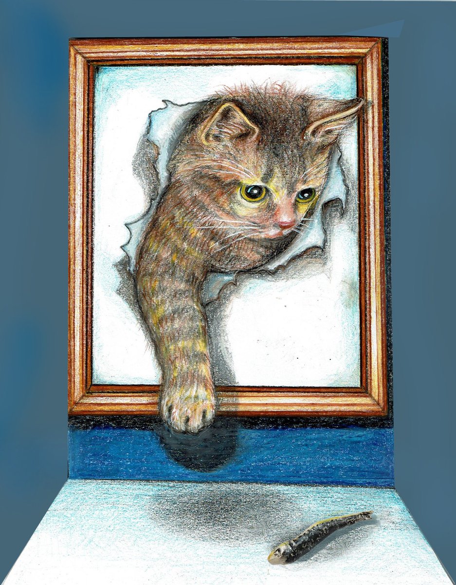 4 67 #色鉛筆 初めての色鉛筆画です。 絵は上手くないからトリックアート風に描いてごまかしてます。猫が狙ってる煮干しは紙粘土で作りました。 22/06/14 12:06