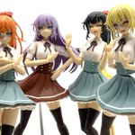 JKユニットRTK(リツカ)揃った(^^)。 ダンス好きらしいから同じポーズでライブっぽいポーズ。黒髪・金髪・紫ヘアーで髪だけエアブラシ塗装。 #創彩少女庭園 #創彩写真部 #コトブキヤ