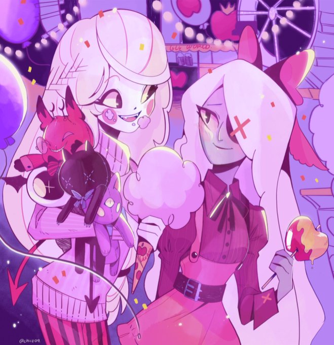 Date in the fair 🎈🍿💕 Oww the girls uwu ~ " Welcome yo LuLu World 🍎✨" ~ #Charlie #Vaggie #HazbinHotel #Charggie #ValentinesDay #HazbinHotelFanart
