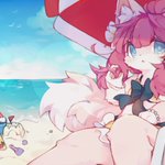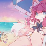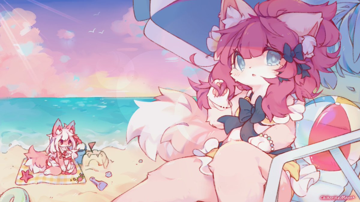 Alternative version! I've seen images of beach with pastel pink, pink, purple palette ect. and that gave me inspiration, so I decided to try it out. Was really fun experimenting 🏖️ This is my first time delivering Skeb commission as well, still have a lot to learn!