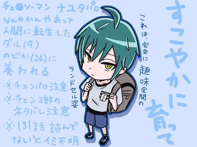 はぁ今日チェンソ更新ねぇなーと思ってたらいつの間にか描いてた落書き ⚠️パロ注意です(ナユタ) 人間に転生しのどかのとこに転がり込んだ子ダル 小3←こだわり