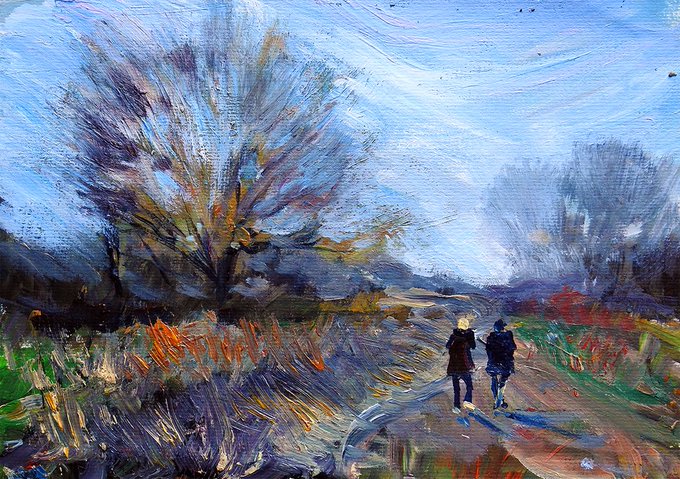 2 6 #paintingoutside #dogwalkers #pleinairpainting #directobservation #landscapepainting #redhead #acrylicpaintings #southyorkshire #biltonart #opencountry #trees #clouds #fineartpaintings #artisticsoul #artfulliving #allaprima #impastopainting #clarifiedimpressionism #winter #cold 22/12/05 14:35