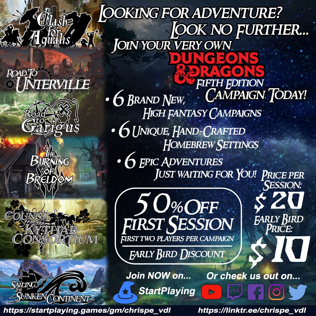 Just dropped 6 new campaigns on #StartPlaying Each takes place in their own unique setting in my homebrew world and each campaign, as always, will feature a custom story tailored to the players themselves. You control the story! #dnd5e#TTRPGs#livestream#dndart#CriticalRole