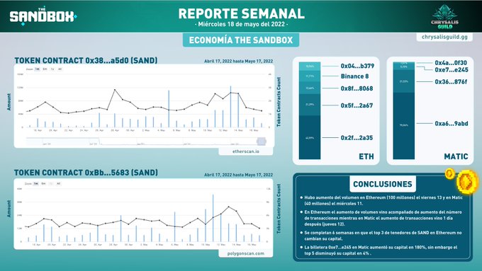 En Matic el volumen pasó de 8m a casi 30m de un día para otro, mientras en Ethereum bajo de 20m de $SAND promedio a 13m Entérate de esto y mucho más en el REPORTE SEMANAL📝de @ChrysalisGuild para #TheSandbox @TheSandboxES 🧊 #SAND #voxelart 💹💯