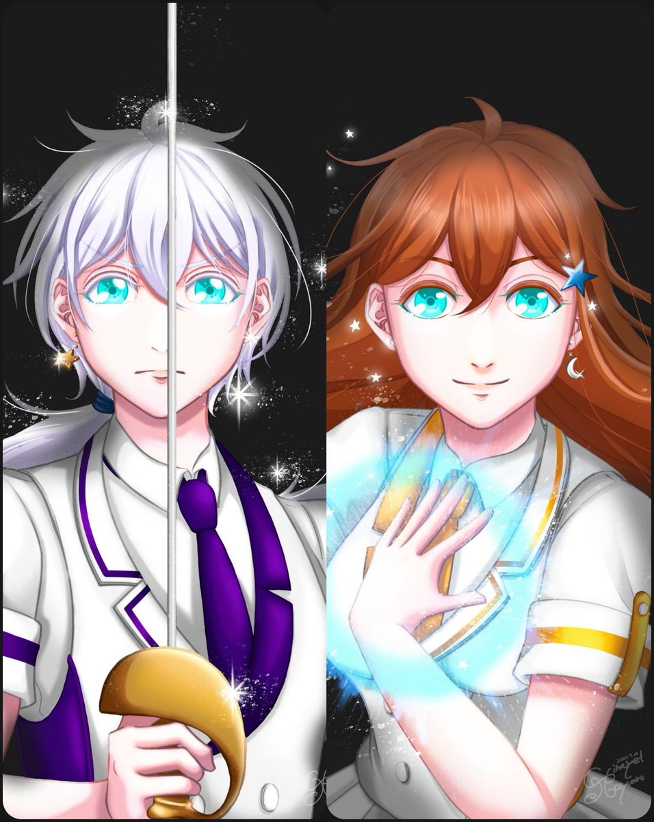 #夏の創作クラスタフォロー祭り #自創作に狂っている人間と繋がりたい #絵柄が好みって人にフォローされたい (相互希望) キラキラした感じの絵を描くのが好きです。 現在頑張って、創作(現代創作神話×転生)の漫画を、2枚目の左側の白銀髪の男女の主人公を中心に頑張って制作中
