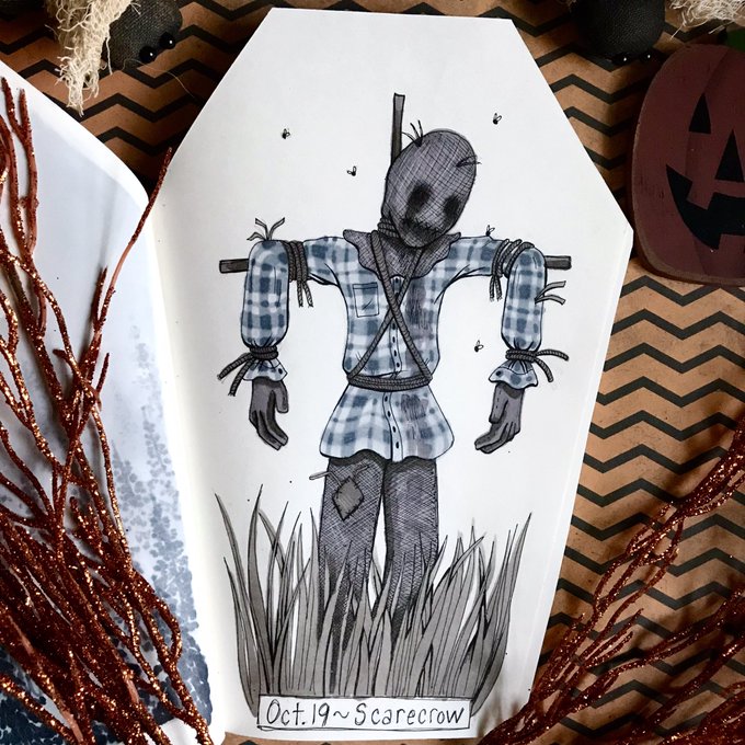 October 19 ~ Scarecrow!🌾🌾🌾 Just a regular, ordinary, perfectly normal scarecrow! No need to get too close! #Inktober #inktober2021 #Halloweenart #scarecrow #drawing #sketchbook #spookyseason
