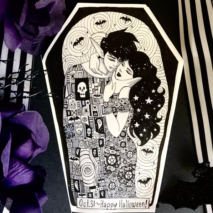 October 31 ~ Happy Halloween!!!🎃👻💀🦇🕸🕷 How about Klimt’s ‘The Kiss’ but make it Halloween instead?😂 I used my OCs Poppy and Patrick from the Halloween comic I’m working on about a witch and a vampire. Halloween is year-round for me!🖤🖤🖤 #Inktober2021 #illustration