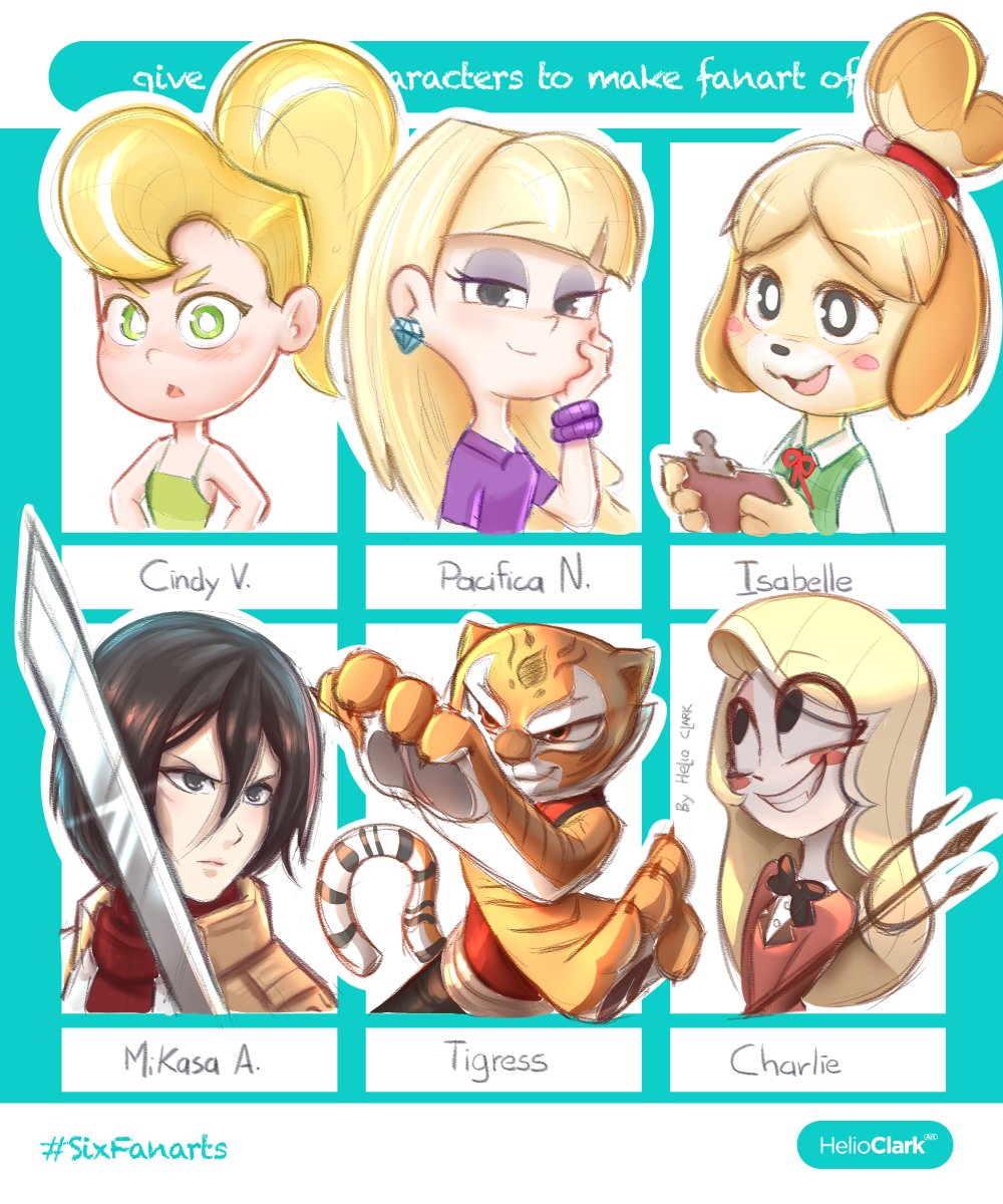Finally done! #sixfanarts❤️ instagram.com/helioclarkcruz Portfolio: artstation.com/helioclarkcruz Retweets are appreciated #SixFanartsChallenge #cindyvortex #pacificanorthwest #Isabelle #mikasa #tigress #Charlie #hazbinhotel #cartoon #gravityfalls #art #portfolio