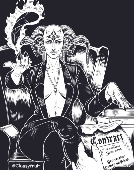 [INKTOBER '22 - DAY 13 - Kind] Who would have thought that a horned business woman would give you the deal of a lifetime at 3 AM? Not you, which is why you embarrassingly don't have a pen at hand. But your visitor is kind enough to help you with that. #inktober #inktober2022
