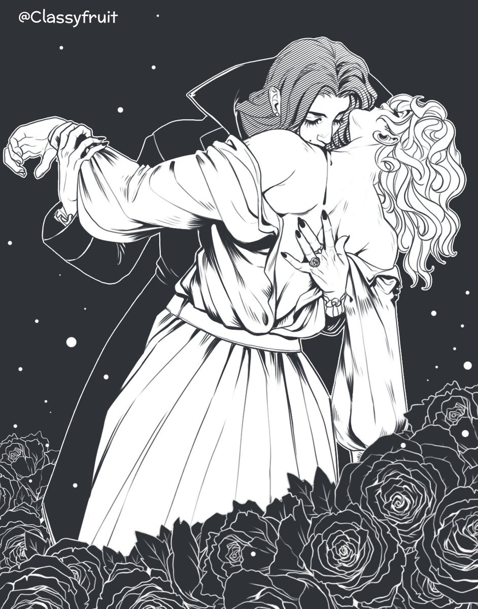 [INKTOBER '22 - DAY 27 - Snack] "The scent of roses, the warm embrace of the Countess, the balmy night air.... it seemed like a dream when a light stinging pain on your neck showed you that there was finally nothing left unshared between the two of you." #inktober #inktober2022