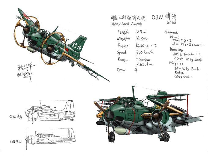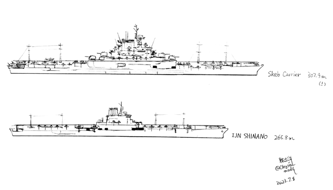 162 737 #架空艦 艦隊軽空母鳴雁型 神州帝国が1945年初頭から多数就役させた戦時急造空母。ブロック工法と電気溶接を多用することで短期間に大量に竣工した。同種の艦艇の中では就役が遅めだが航空設備が先進的で、前部射出機が噴式戦闘機に対応した蒸気式になっている。 23/08/17 22:33