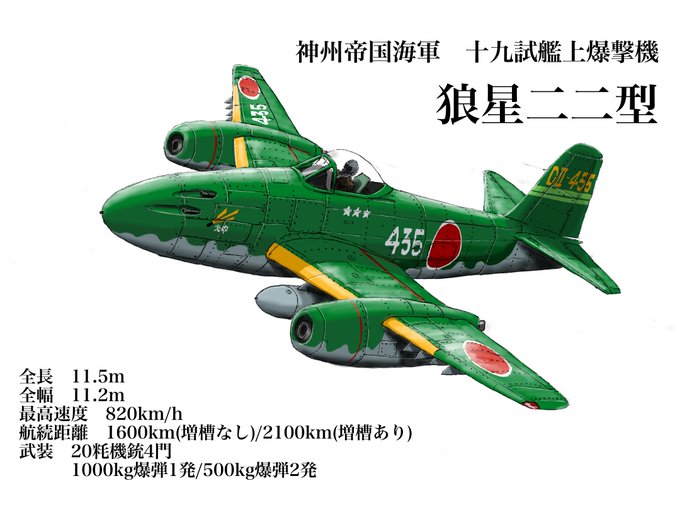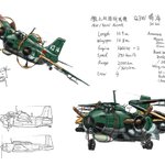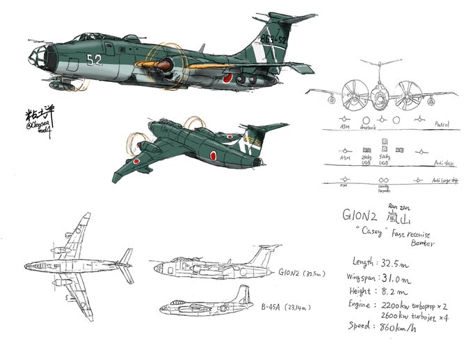 高速陸上攻撃機 嵐山(架空機) 高速機ながら生産性が悪く搭載量も控えめなので他機種と併用。専ら武装偵察機として運用された。原始的な空対艦ミサイルも運用できるがあくまで誘導爆弾の射程延伸型で、好条件下でなら視程内の目標に高高度スタンドオフ攻撃が可能といった代物。