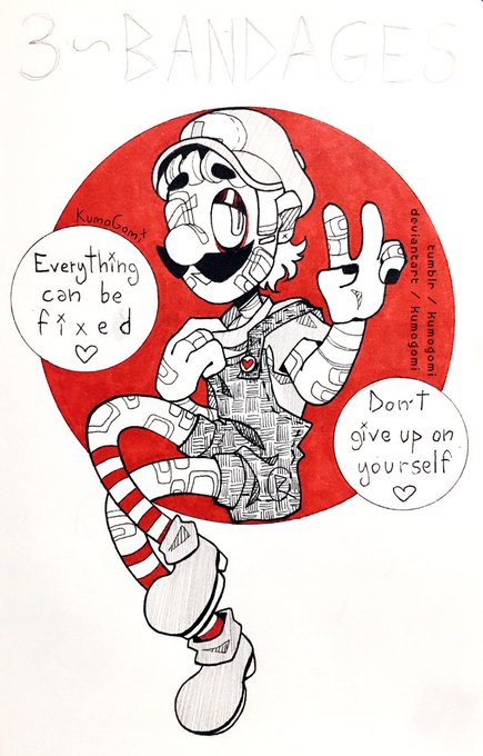 "Everything is gonna be okay." Third #inktober drawing! And it's "bandages". I don't feel so good lately, both physically and mentally- I needed some kind of reassurances so here we are with this ahah. #inktober2019 #luigimario #luigifanart #nintendofanart