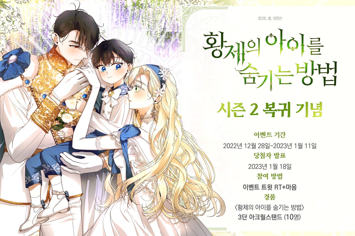 <황제의 아이를 숨기는 방법> 🌈시즌 2 복귀 기념 이벤트🌈 본 트윗을 RT+마음해 주신 분들 중 추첨을 통해 열 분께 시즌 2 표지 ✨삼단 아크릴을✨ 보내 드립니다! 아스텔은 계속해서 카이젠을 속여 테오르를 숨길 수 있을지…? ▼시즌 2가 궁금하다면? page.kakao.com/home?seriesId=…