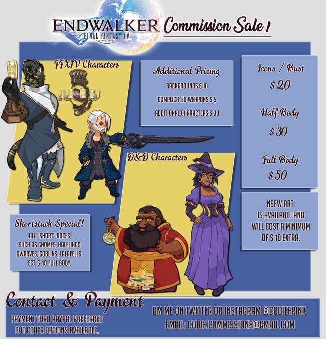 To celebrate the #Endwalker release soon, I'm doing a BIG commission sale! I specialize in #DnD and #FFXIV artwork but can adjust to others. Slots can be secured for your #Endwalker characters. DM me with any questions. #commissionsopen #FFXIVART #dndart #dnd5e #comissions