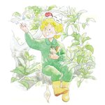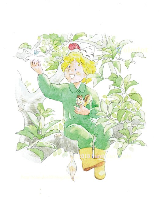 #みどりの日なので緑色の画像を貼る 5年前のお仕事の『身近な自然と遊んで育つ保育実践―スウェーデンの自然環境教育から』(わかば社)のイラストです🌳自然教育プログラム「森のムッレ教室」のキャラクター。全てアナログ…。今やるなら塗りはデジタルですね。 #イラスト