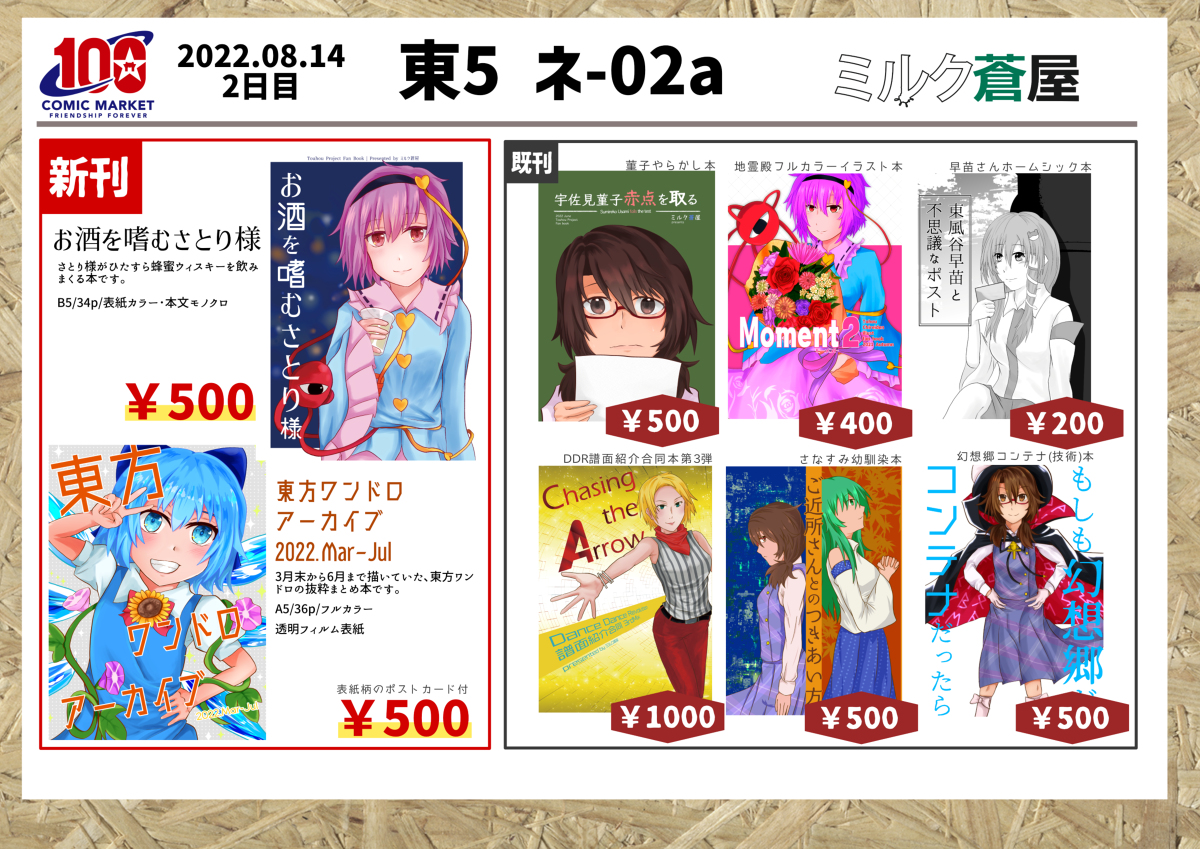 あなたのサークル「ミルク蒼屋」は、コミックマーケット100で「日曜日東地区 "ネ " 02a」に配置されました!コミケWebカタログにてスペース配置場所公開中です! webcatalog.circle.ms/Circle/Map/162… #C100WebCatalog 受かったので酒感想怪文書を出します あとワンドロまとめ本もだすぞ!よろしくお願いします!