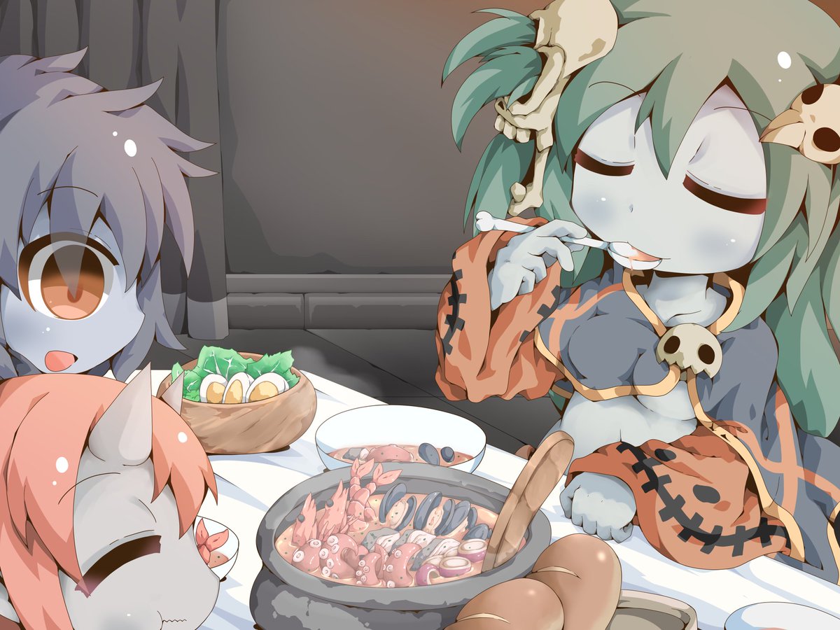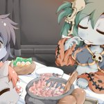 マリーカの好きな食べ物という題目にて、ブイヤベース風の魚介スープを頂くマリーカたちです。