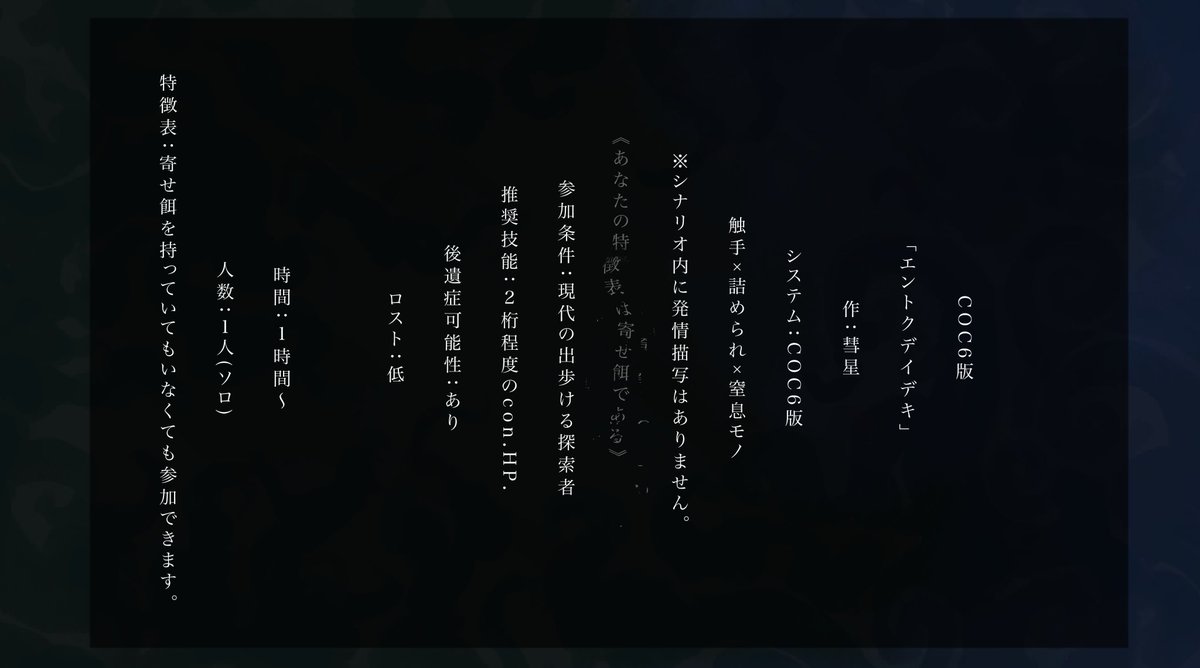 エントクデイデキ【クトゥルフ神話TRPG6版】 | つごもり堂 tsugomorido.booth.pm/items/3138588 #booth_pm COC6版 「エントクデイデキ」 作:彗星 システム:COC6版 触手×詰められ×窒息モノ ※シナリオ内に発情描写はありません。 #ポットラックパーティー企画 公開しました!!!間に合ってないが?0円です。