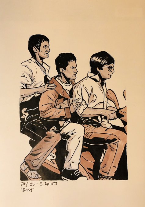 Inktober Day 25 - “Buddy” - 3 Idiots (2009) . Just like “PK”, I went in to this one worried and by about the halfway point I loved it. I definitely need to watch more Indian cinema. . #inktober2020 #ink @inktober #buddy #3idiots #bollywood #aamirkhan