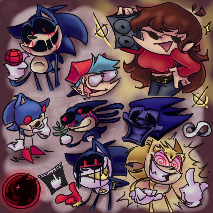 Rewatching the sonic movie while making these doodles inspired on the fnf sonic exe mod round 2 update. This is actually the first time I draw Sonic, Bf and Gf digitally. Also that sick-ass design next to Fleetway (my beloved) belongs to @JamiPurple . #sonicexe #fridaynightfunkin